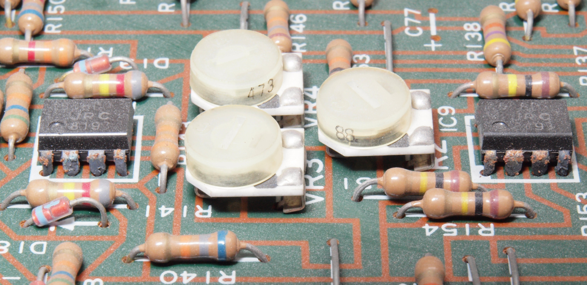 A62. 点検中 MPX基板の足黒IC−2、左上は磨いてある。磨くより交換の方が安心確実。