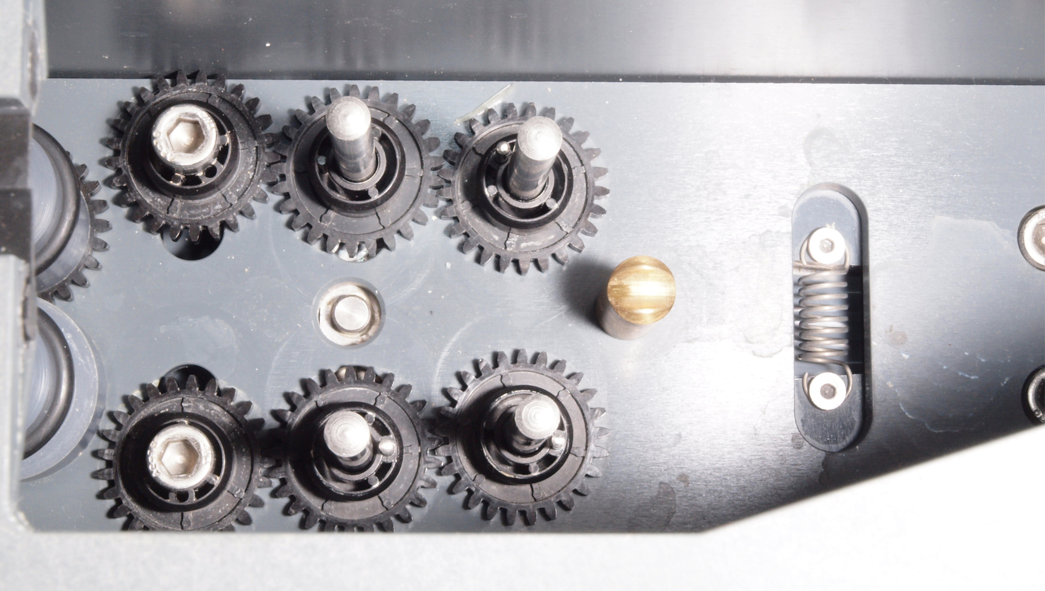| A42. 点検中 レコード駆動部を見る。左側がレコード回転ローラー、右2段4個洗浄ブラシ駆動。 | ||||||||||||||||||