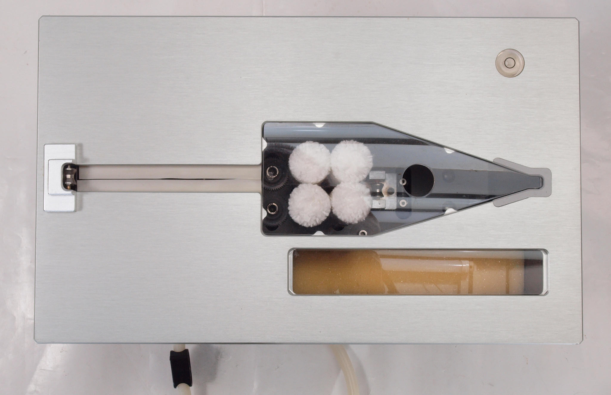| E2. 洗浄開始。洗浄液がタンクより出て水面上昇し高周波振動による洗浄開始。 レコードが回転し始め、4本ブラシローラーが2本づつレコードをはさむように回転しブラシ洗浄開始。 |