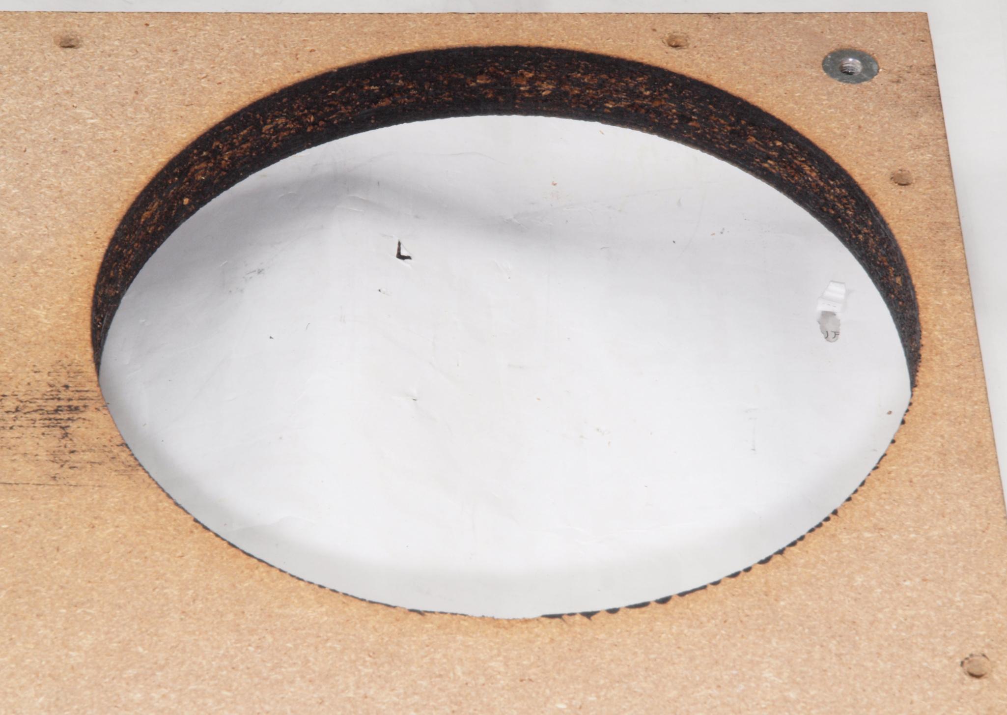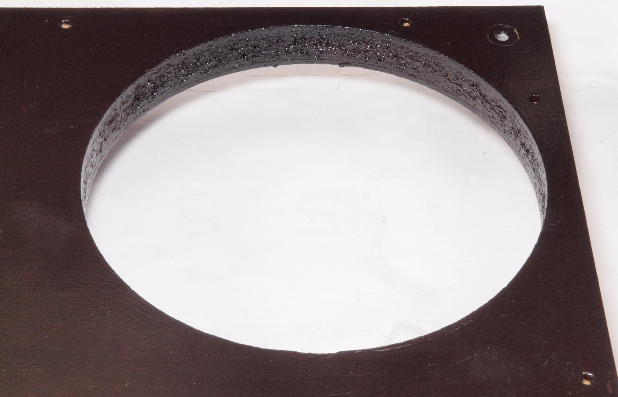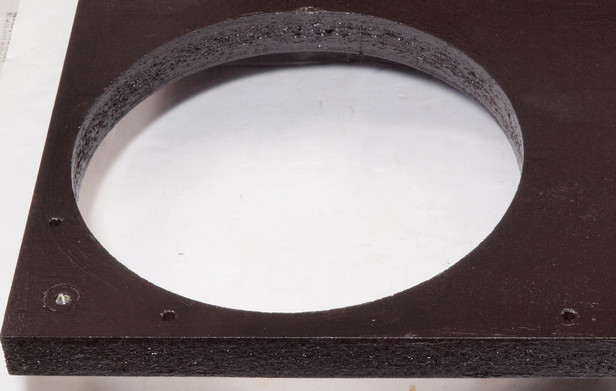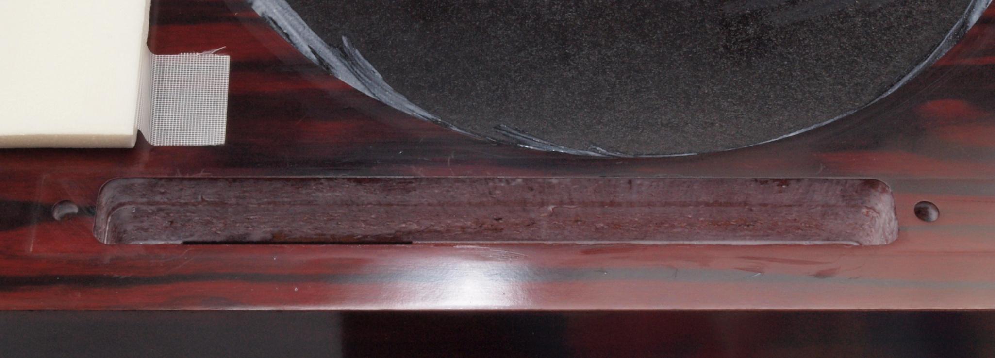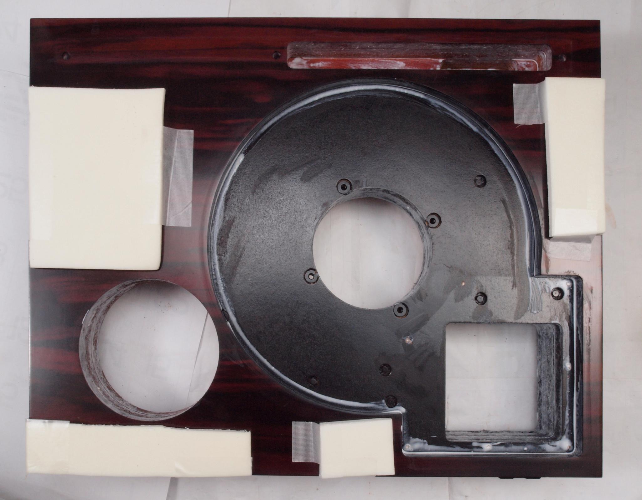W25. 修理中 モーター取付穴、タンテーブル軸受取付穴、反対側。 圧縮材にボンドを染みこませる。