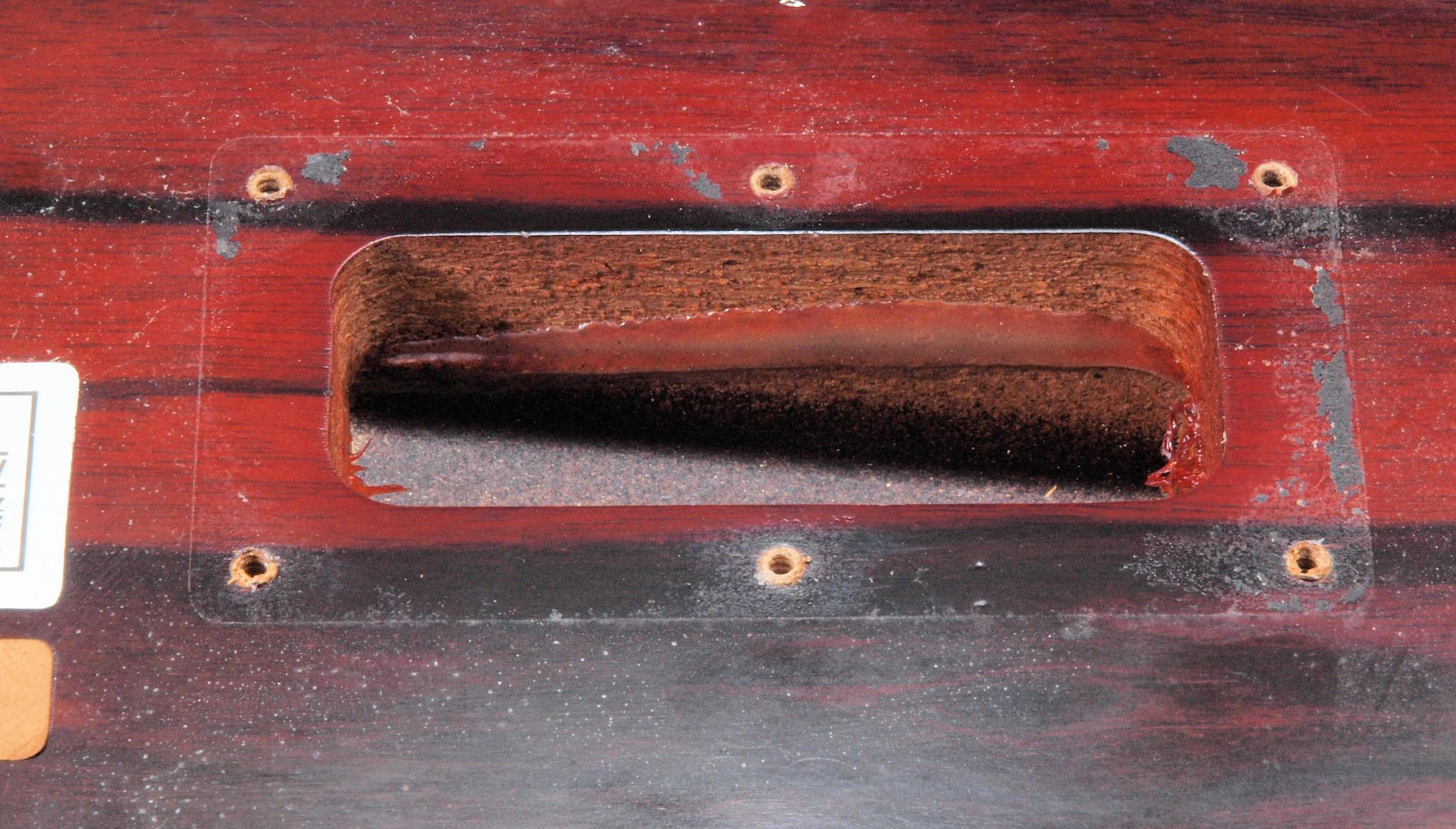 WC5. 修理中 下蓋のトランスカバー取り付穴、反対側。ボンドを染みこませる、ネジ穴も塗る。