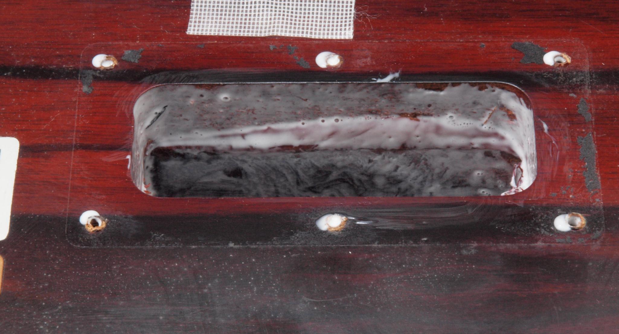 WC2. 修理中 下蓋のトランスカバー取り付穴。ボンドを染みこませる、ネジ穴も塗る。