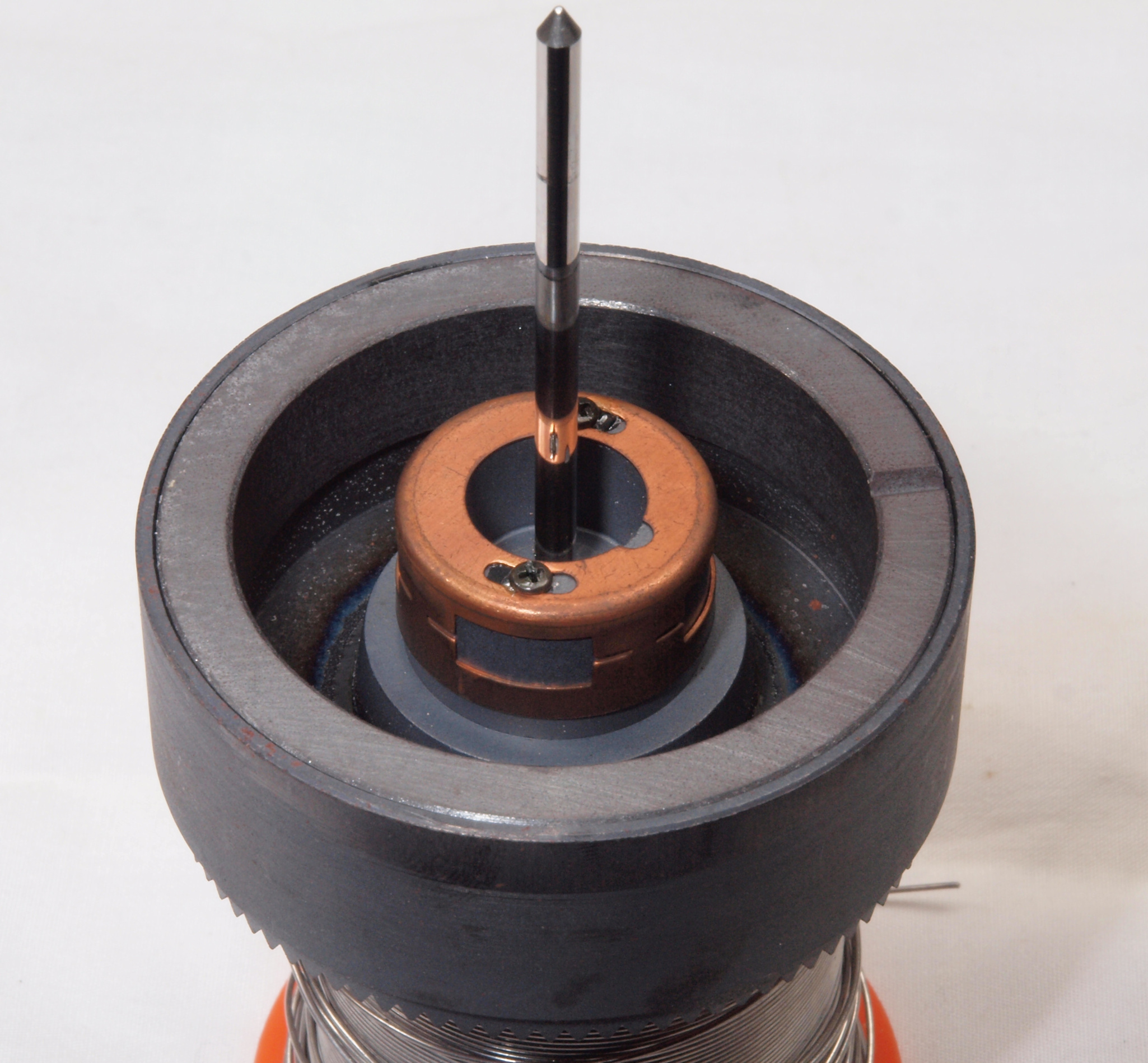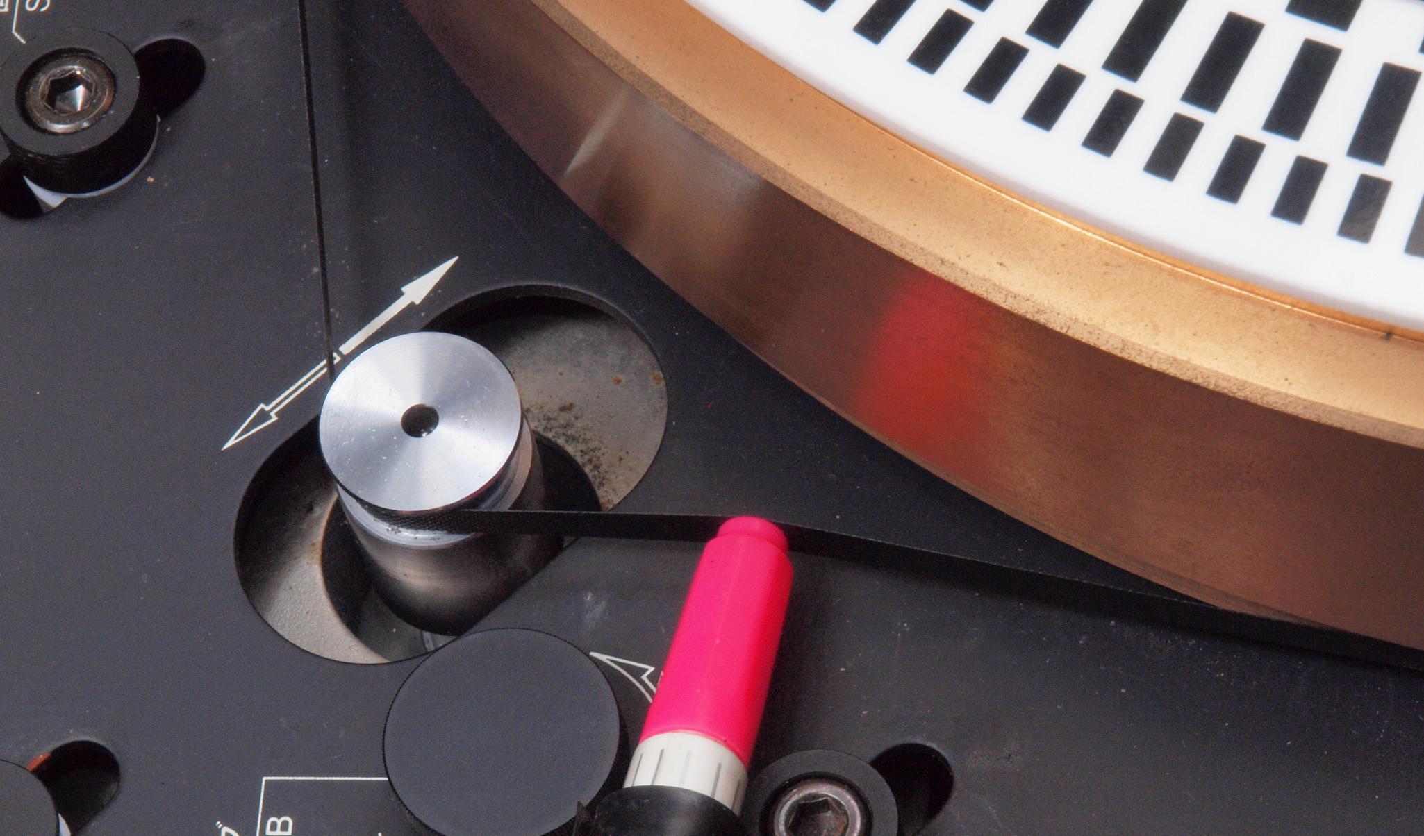 A1A. 点検中 タンテーブルを外し、上から見る。タンテーブル(プラッター)軸。粘度の低いオイルを使用した! 高負荷の軸受けは高粘度オイルを使用する。