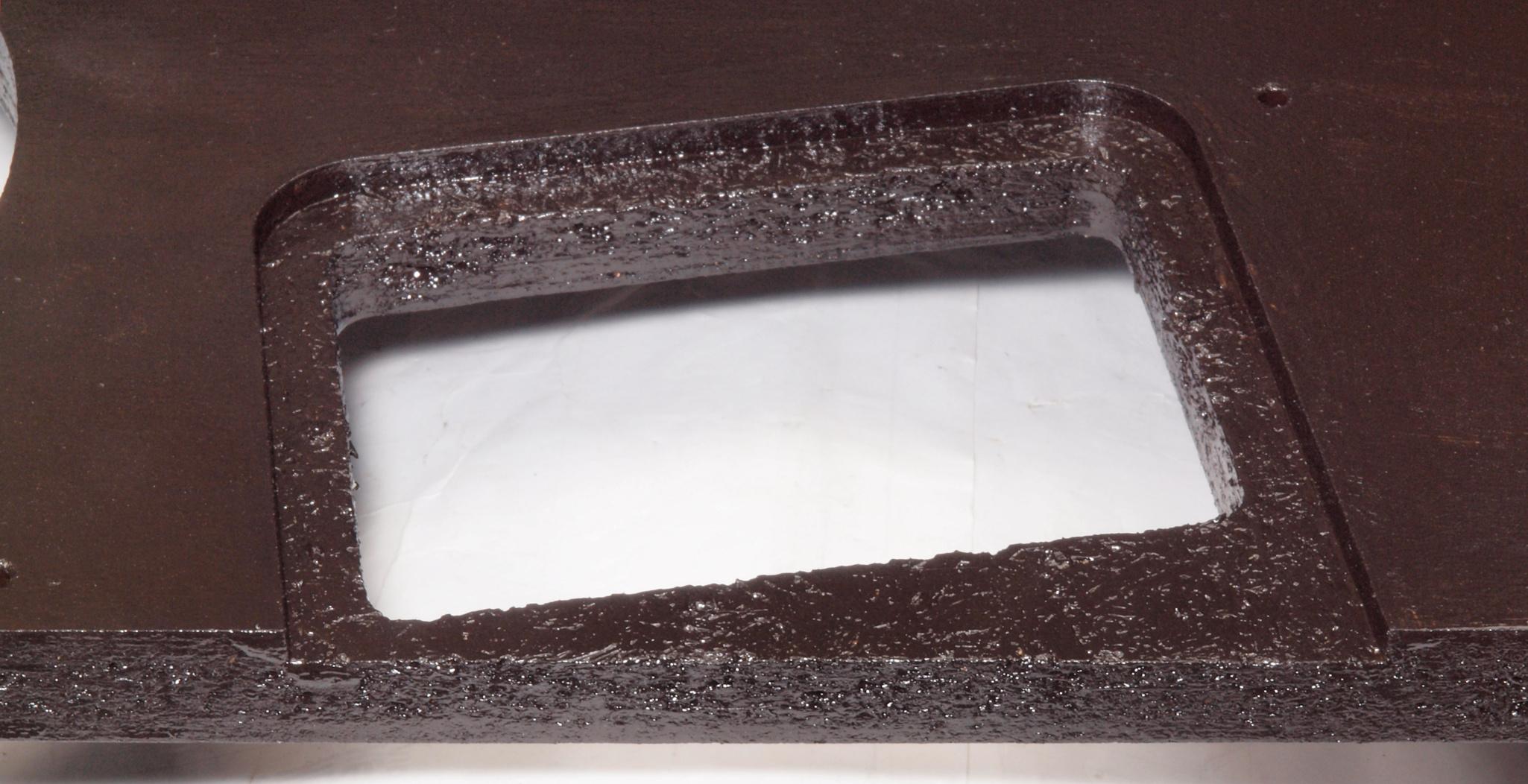 WB5. 修理中 下蓋のアーム取り付穴、反対側。ボンドを染みこませる、ネジ穴も塗る。